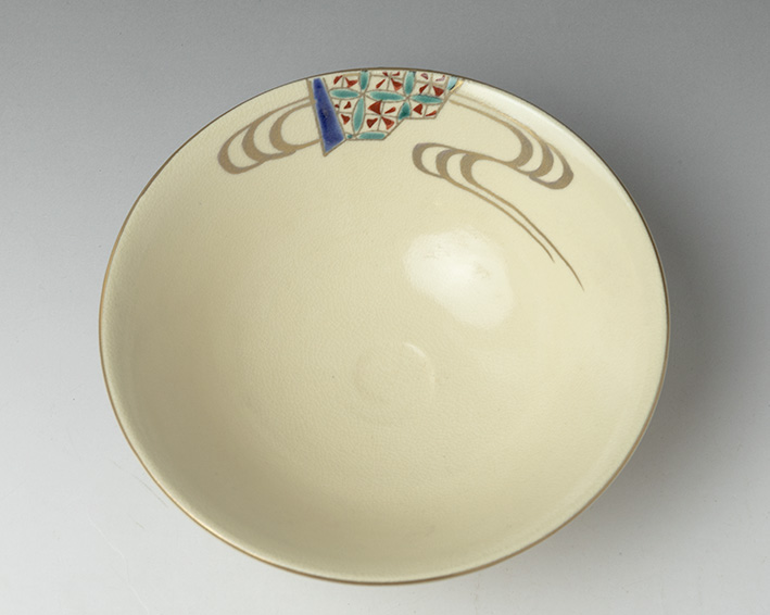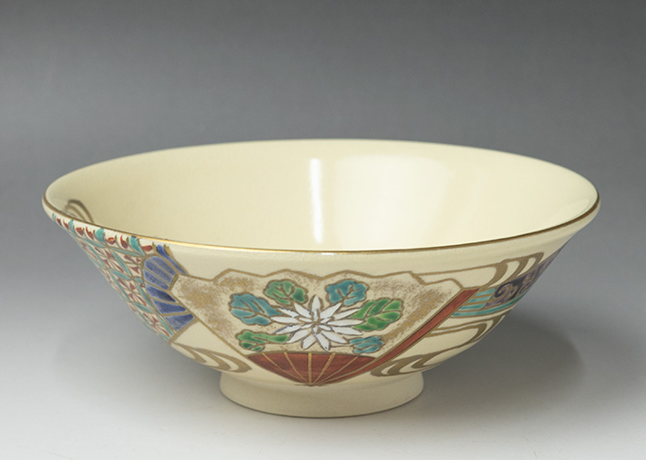 A simple crackled cream chawan enhanced with a detailed Japanese fan design. The overglaze pattern gives the otherwise smooth bowl an interesting texture and the jewel colors and gold paint add warmth and vitality.
