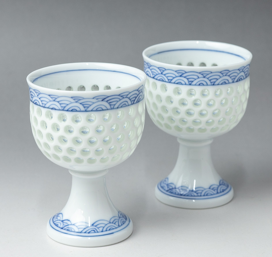 A very unique cup from Hasami, Nagasaki prefecture. The small holes around the sides are individually punched out by hand to create a lacy pattern and then filled in with "secret crystal", a material whose exact properties are known only to the craftsmen of the kiln! When held up to the light, the holes sparkle, adding a lovely translucent quality to the white porcelain which is further offset by bands of sometsuke wave patterns. Exquisite craftsmanship!