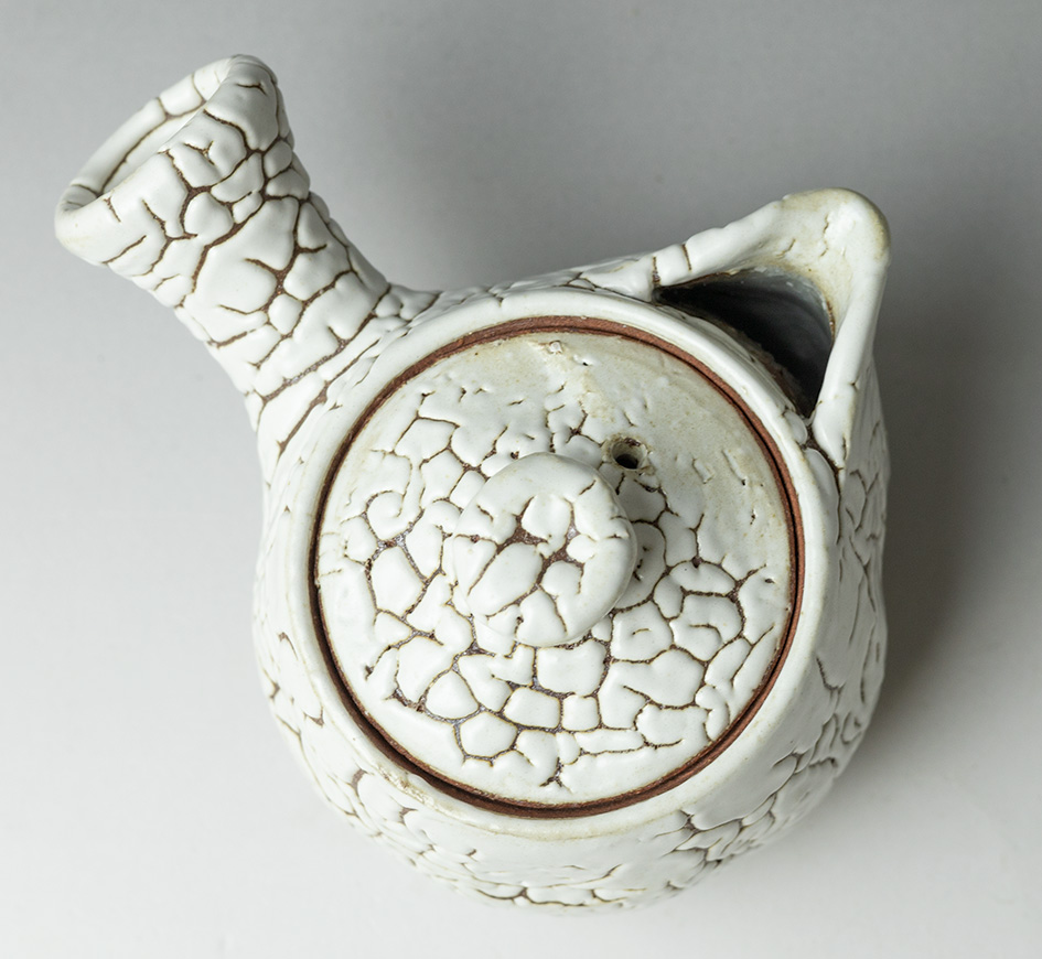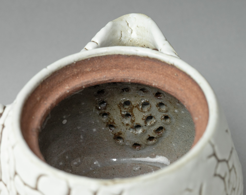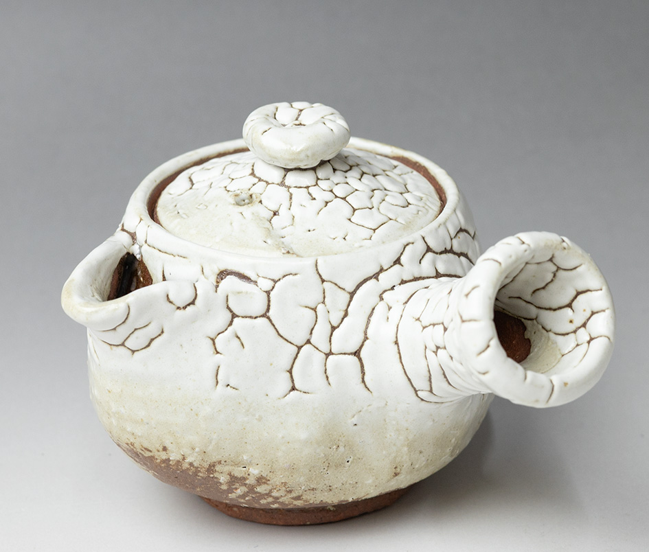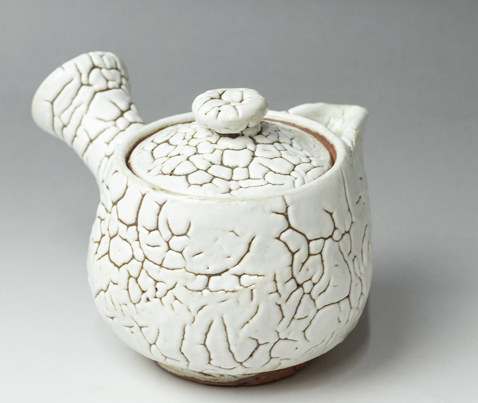 Thickly glazed in the kairagi style, this small teapot is the ideal size for gyokuro and high quality sencha green tea. The "kairagi"pattern, so named because it was thought to resemble the sharkskin used for the handles of Samurai swords, provides a perfect contrast between the smoothness of the glaze and the textured clay beneath.