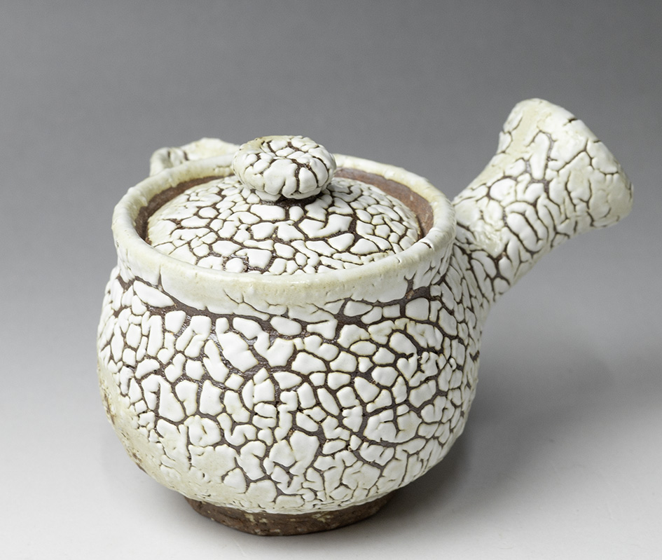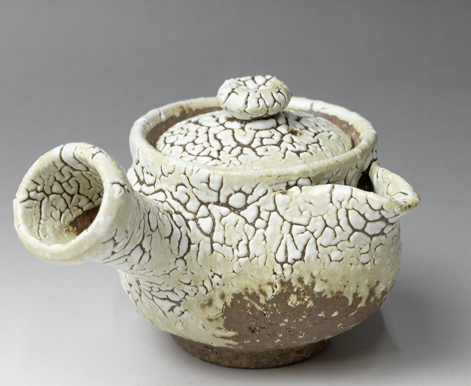 Thickly glazed in the kairagi style, this small teapot is the ideal size for gyokuro and high quality sencha green tea. The "kairagi"pattern, so named because it was thought to resemble the sharkskin used for the handles of Samurai swords, provides a perfect contrast between the smoothness of the glaze and the textured clay beneath.