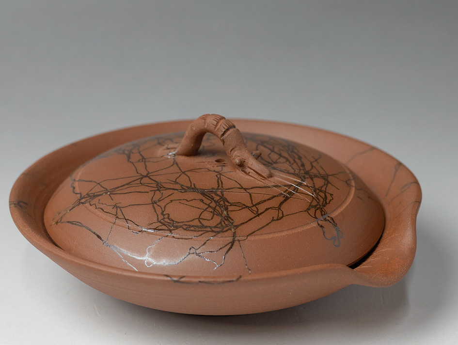 The knob is in the shape of an algae shrimp. Mogake is a traditional technique consisting of applying seaweed on unglazed teapots before firing.