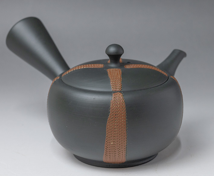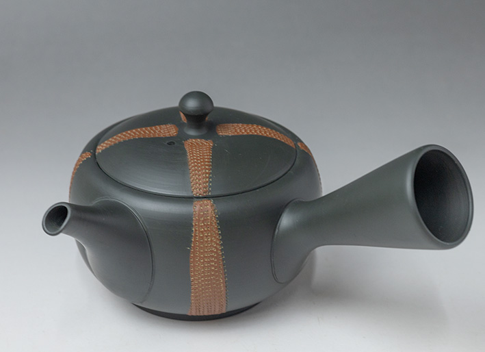 This teapot appears black in the picture, but depending on the lighting, it reveals a deep greenish hue.