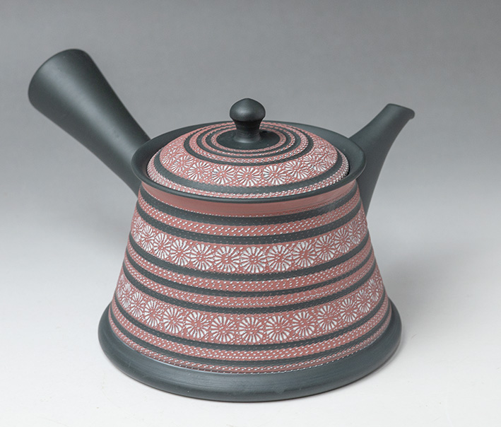 and embossed flower designs in lovely contrasting colors of pink and white grace this dark green teapot by Isobe Teruyuki.