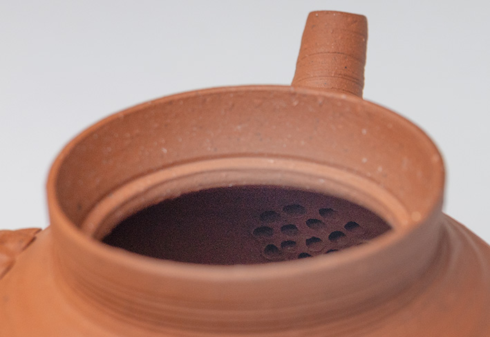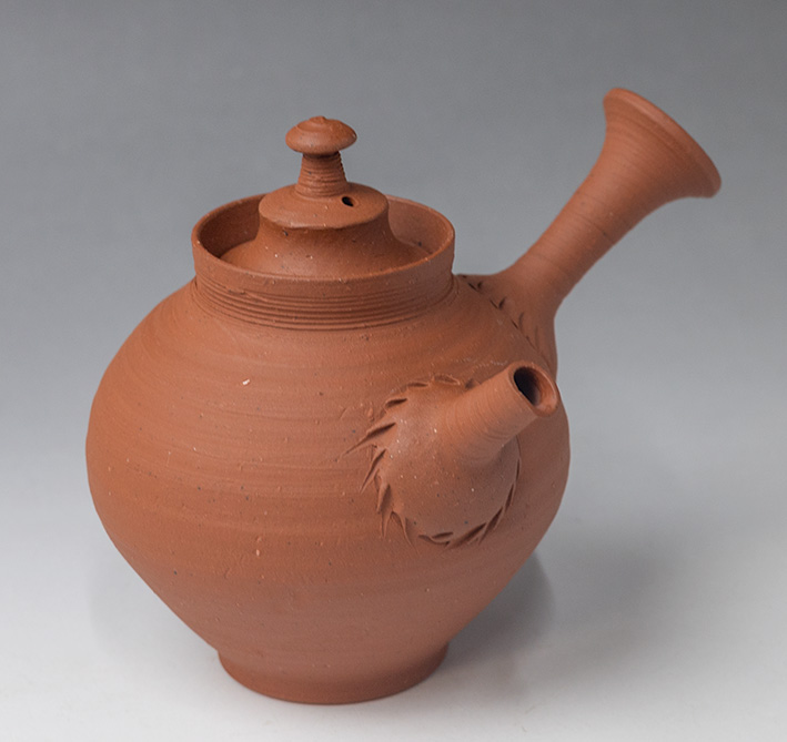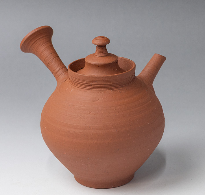 This is a shudei teapot by Yamada Sou, the grandson of Living National Treasure Yamada Jozan 3rd. The "hikime"horizontal lines and the handmade touches on the body of the pot are reminiscent of the masterpieces created by Jozan 3rd and bear witness to the the careful instruction which Yamada Sou's grandfather was able to give him. Yamada Sou does not grind the lid to make it fit perfectly, because he prefers to leave the lid untouched after firing. The small space around the lid means there is less chance of the lid sticking. This was taught to him by his grand father Yamada Jozan 3rd. As Japanese tea is poured more slowly than Chinese tea, water will not leak from around the lid.
