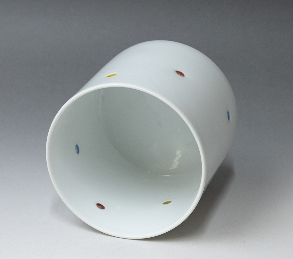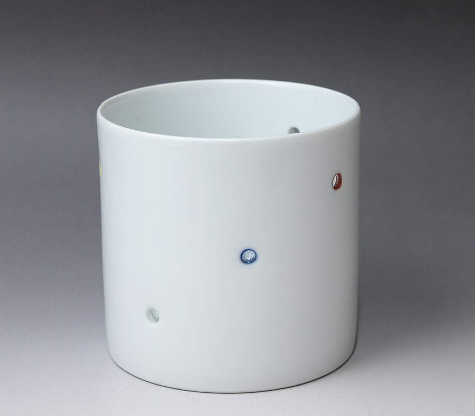 A very unique cup from Hasami, Nagasaki prefecture. The small holes are punched out, colored and then filled in with "secret crystal",