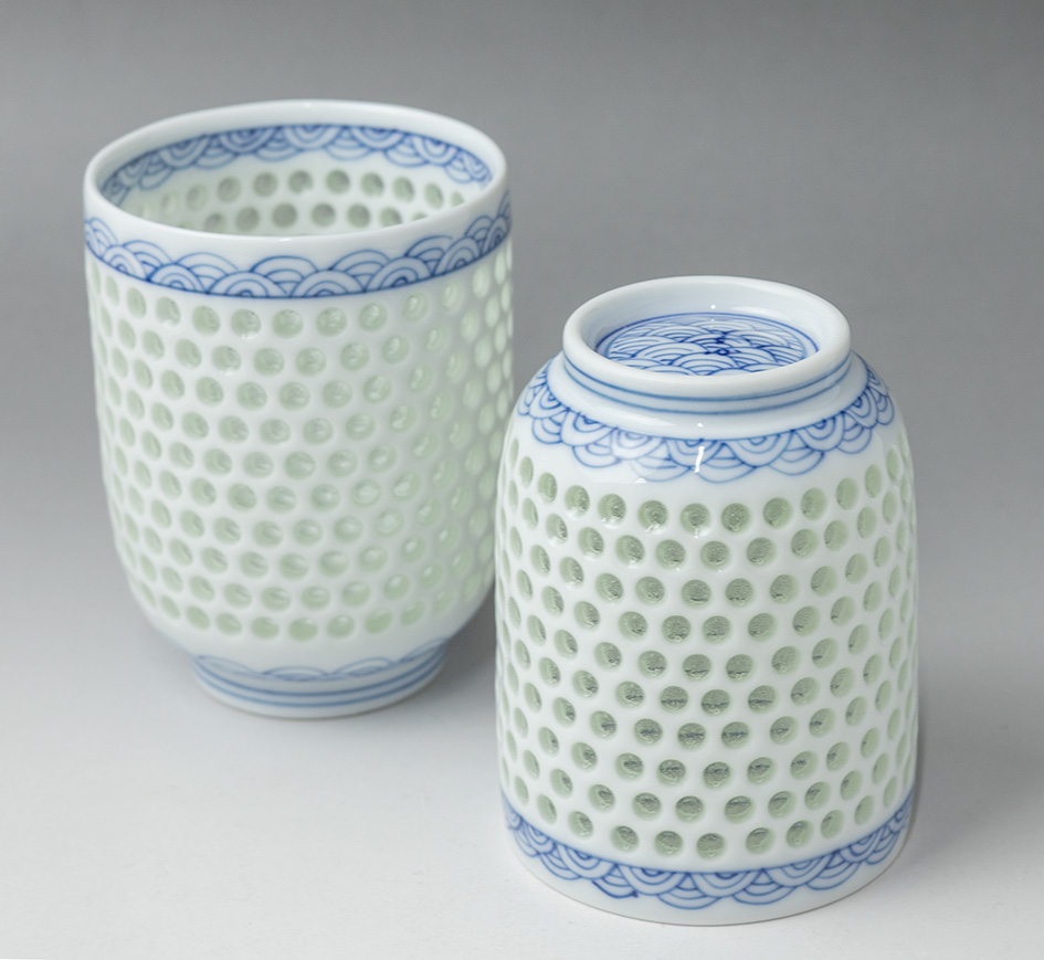 A very unique cup from Hasami, Nagasaki prefecture. The small holes around the sides are individually punched out by hand to create a lacy pattern and then filled in with "secret crystal",