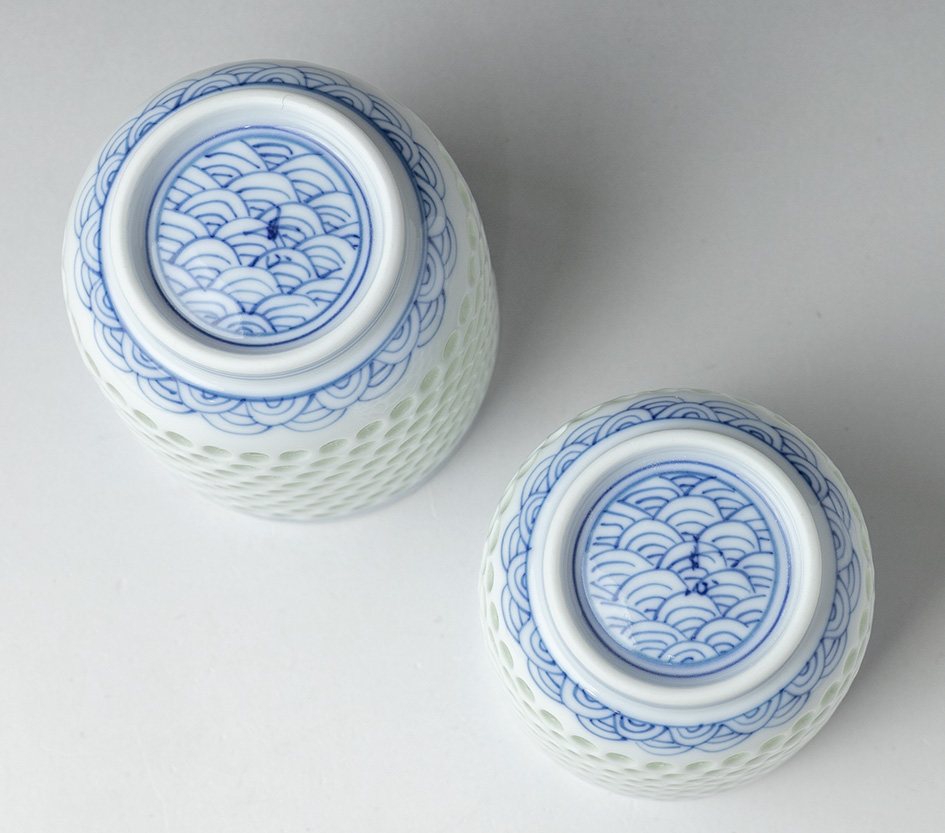 adding a lovely translucent quality to the white porcelain which is further offset by bands of sometsuke wave patterns.