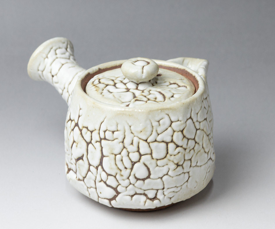 Thickly glazed in the kairagi style, this small teapot is the ideal size for gyokuro and high quality sencha green tea. The "kairagi"pattern, so named because it was thought to resemble the sharkskin used for the handles of Samurai swords, provides a perfect contrast between the smoothness of the glaze and the textured clay beneath.