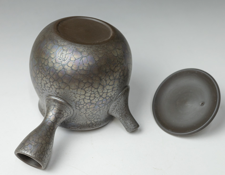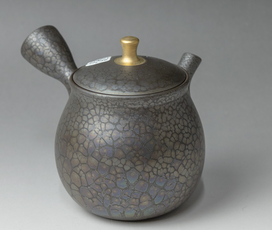 The tenmoku (oil droplet) design on this teapot bears witness to Shoryu’s technique and creativity. The tenmoku design usually needs a thick glaze,