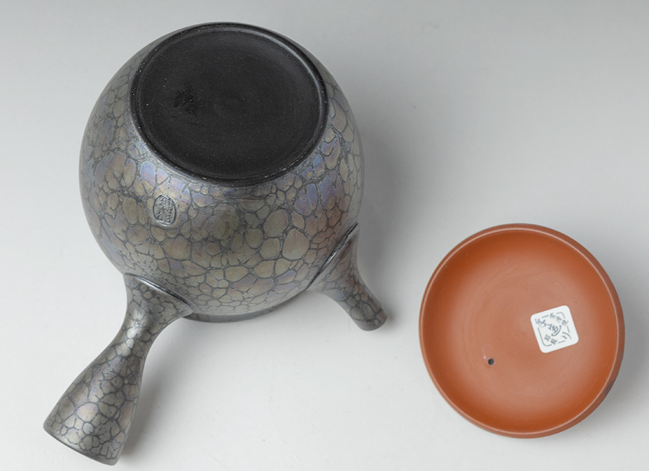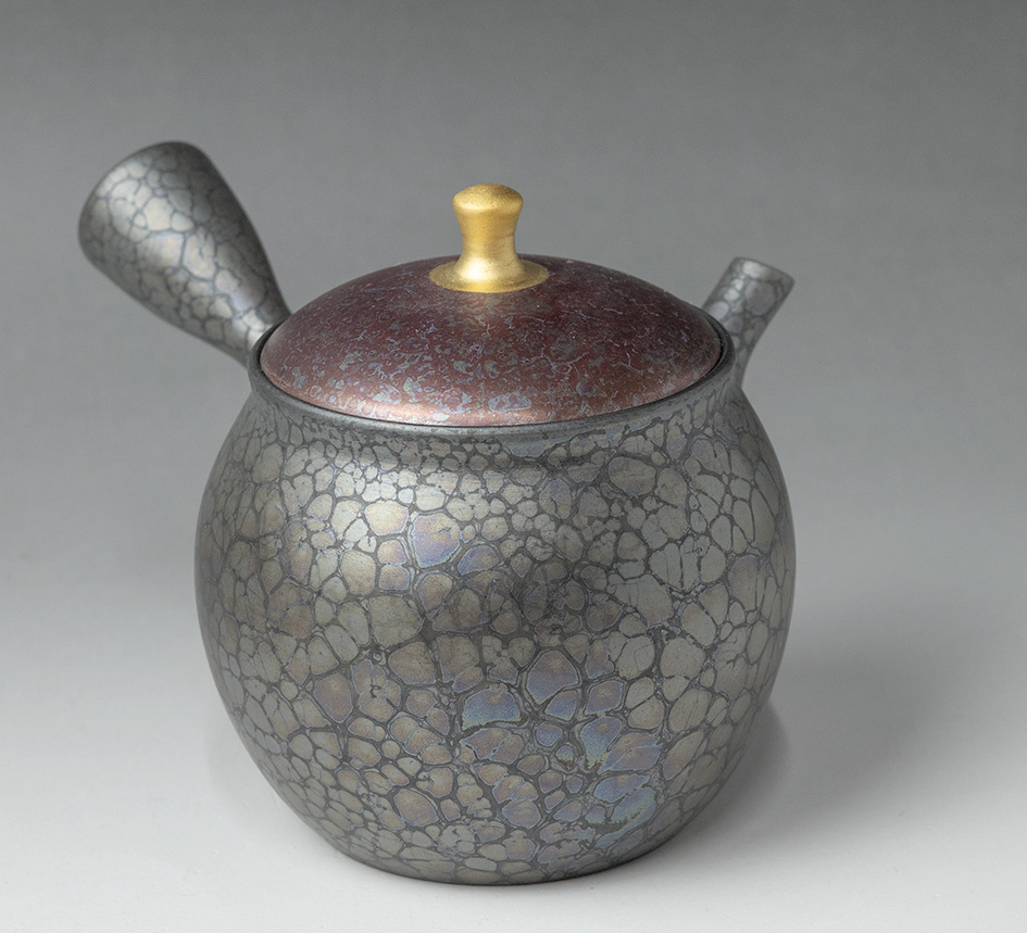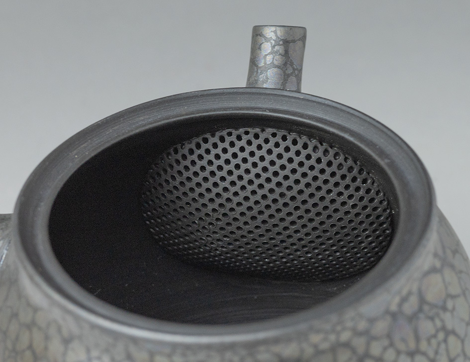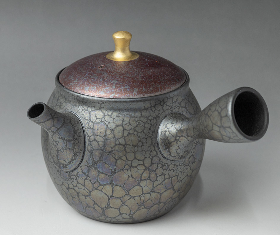 The tenmoku (oil droplet) design on this teapot bears witness to Shoryu’s technique and creativity. The tenmoku design usually needs a thick glaze,