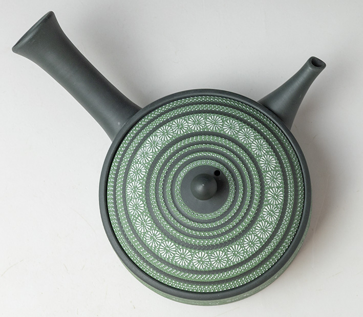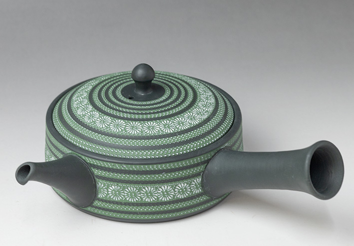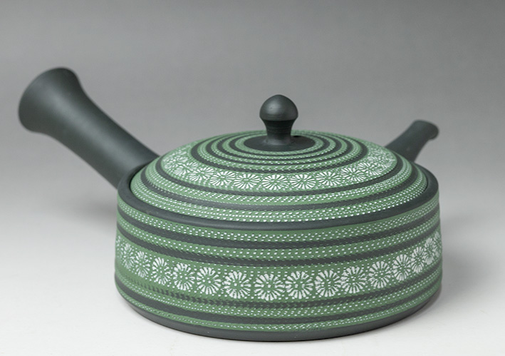 and Impressed flower designs in lovely contrasting colors of green and white grace this flat dark green teapot by Isobe Teruyuki.